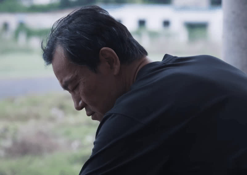 剧中他坐在小板凳上佝偻着背、起身离开时脚步沉重,格外沧桑。