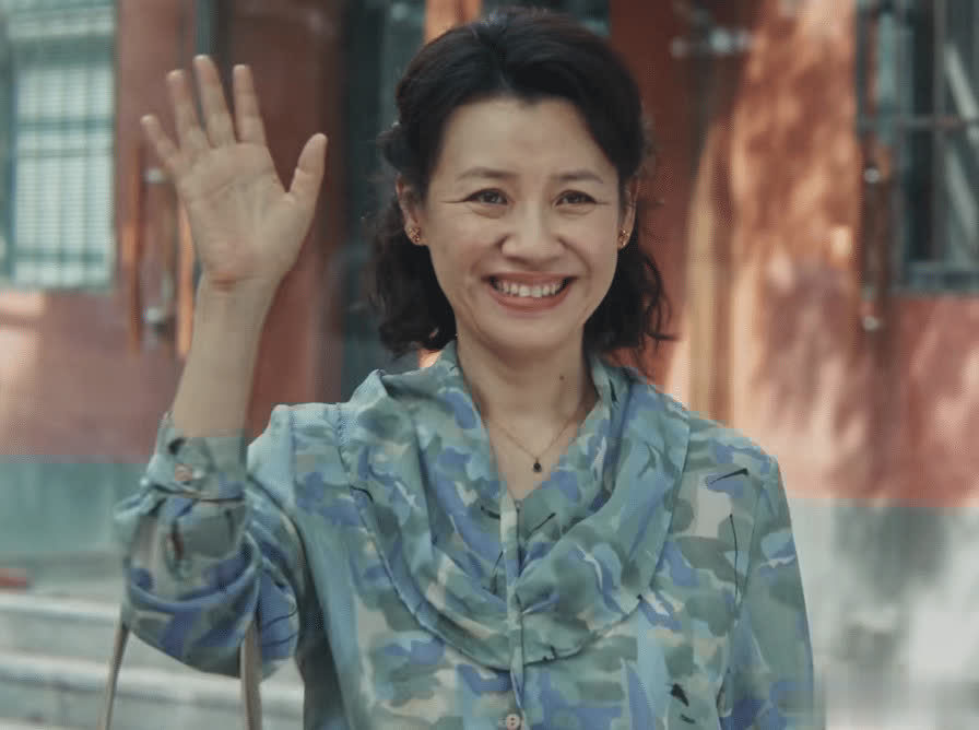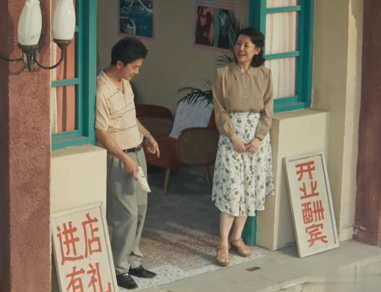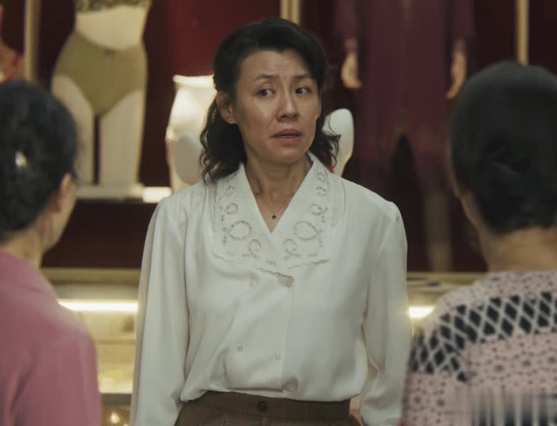缎面V领的双排扣衬衣,对比剧中同龄妇女花花绿绿、松垮垮的衣服,显得更加时髦。